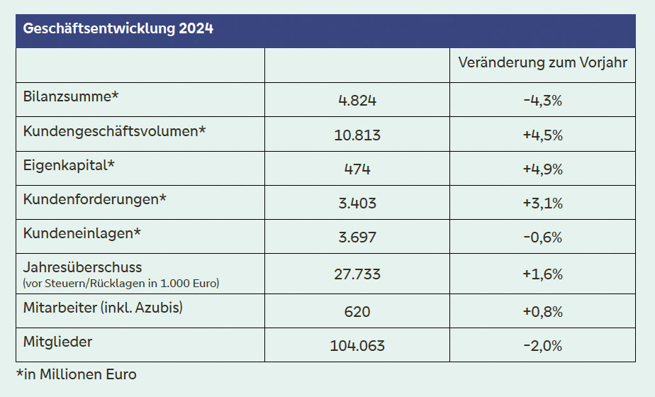 Die Zeiten werden unruhiger, der gesellschaftliche Konsens ist weg“, fasst Vorstandsvorsitzender Eberhard Spies die Situation der VR Bank zusammen. „Aber unsere Bank ist weiterhin gut aufgestellt.“ In einer ganzen Reihe von Veranstaltungen informierte der Vorstand die Gremien der VR Bank über die Geschäftsentwicklung (siehe Tabelle), zunächst bei den MitgliederForen im Februar und März, dann bei der Vertreterversammlung im Mai. Die Zahlen sind trotz der schwierigen Umstände sehr erfreulich, der Rückgang der Bilanzsumme ist gewollt: Refinanzierungstender wurden 2024 zurückgezahlt. Deshalb stimmte die Vertreterversammlung einer Dividende von drei Prozent zu. Vor allem die veränderten Vertriebswege erfordern eine Neuausrichtung der internen Prozesse und der Infrastruktur: Immer mehr Kundinnen und Kunden erledigen ihre Bankgeschäfte online (derzeit mehr als die Hälfte) und kommen nur noch selten in die Geschäftsstelle. Die digitale Erreichbarkeit muss mit dieser Entwicklung Schritt halten. Dies erfordert hohe Investitionen sowohl in Hard- und Software als auch in die Datensicherheit. Die gesetzlich erhöhten Reserven für Kredite führen außerdem zu einem deutlich erhöhten Kapitalbedarf. „Trotz eines schwierigen Jahres erhalten wir die Zukunftsfähigkeit der Bank und bauen sie weiter aus“, macht Eberhard Spies deutlich. „Nach der Einarbeitungsphase im Anschluss an die Fusion werden nun die internen Prozesse weiter angepasst und auf Effizienz getrimmt.“ Um für die Herausforderungen der kommenden Jahre gut gerüstet zu sein, wird der Generationswechsel im Vorstand weiter vorangetrieben: Der Aufsichtsrat hatte Eberhard Spies gebeten, seinen ursprünglich Mitte 2025 auslaufenden Vertrag bis Ende 2026 zu verlängern. Nachdem die geplante Nachfolgeregelung mit Marco Beckbissinger nicht umgesetzt werden konnte, hat der Aufsichtsrat Daniel Mohr (bisher Vorstand der Volksbank Neckartal eG) Ende 2024 bestellt. Er soll ab Herbst 2025 das Vorstandsteam verstärken und sich auf die Übernahme des Vorstandsvorsitzes Anfang 2027 vorbereiten. Auch auf der zweiten Führungsebene werden in den kommenden Monaten und Jahren aufgrund des demografischen Wandels Mitarbeiterinnen und Mitarbeiter in den Ruhestand gehen. Jüngere Kolleginnen und Kollegen 6 rücken nach und neue Strukturen (wie etwa Regionaldirektionen) werden geschaffen. Um den eigenen Nachwuchs auszubilden und die Region auch im Ausbildungsbereich zu stärken, stellt die VR Bank 74 Ausbildungsplätze zur Verfügung, fördert Hochschulen und Job-Börsen in der Region. Eberhard Spies unterstrich die Wichtigkeit der Ausbildung und forderte alle Betriebe auf, dabei mitzuhelfen. Zur Verschlankung der Strukturen wurde der Aufsichtsrat von 24 auf 18 Personen verkleinert – zwölf Vertreter der Mitglieder und sechs der Beschäftigten („Drittelbeteiligung“). Wegen drohender Geldautomatensprengungen und mangelnder Kundenfrequenz mussten Geschäftsstellen geschlossen werden. Gemeinsam mit den Sparkassen der Region werden Geldautomaten betrieben, „um die Bargeldversorgung unserer Kundinnen und Kunden auch in Zukunft sicherzustellen“, betont der Vorstandsvorsitzende (siehe auch Seiten 24 und 25). Das Unternehmensleitbild und die Unternehmenskultur entwickeln sich weiter: In einer größer gewordenen Bank mit vielen Standorten ist die Kommunikation untereinander zentral und muss ständig überprüft und verbessert werden. Für den Vorstandsvorsitzenden ist und bleibt die Unterstützung der Region durch die VR Bank wichtig: Das Vermögen der VR Bank Stiftung wurde darum nach der Fusion mit Heilbronn auf sieben Millionen Euro erhöht. Mit den Erträgen aus der Stiftung und dem GewinnSparen werden Vereine, Organisationen und Institutionen gefördert – im Jahr 2024 waren es insgesamt 1,4 Millionen Euro, die in die Region zurückgeflossen sind.